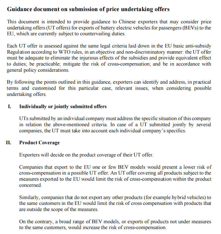 2024年10月,欧盟宣布对中国电动汽车展开反补贴调查,并于当月31日正式实施为期五年的反补贴税,税率范围为7.8%至35.3%,综合税率最高可达45.3%。这一决定引发了中欧双方的广泛关注,并促使双方展开多轮磋商,寻求妥善解决方案。经过数月的谈判,欧盟最终发布了上述指导文件,为争议的解决提供了新的框架。