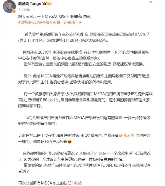 理想汽车近日宣布,其针对部分2024款理想MEGA电动汽车的召回工作已取得显著进展。截至目前,召回完成率已突破97.5%,在总计11411辆召回车辆中,已有11128辆完成相关部件更换,剩余283辆尚未完成。