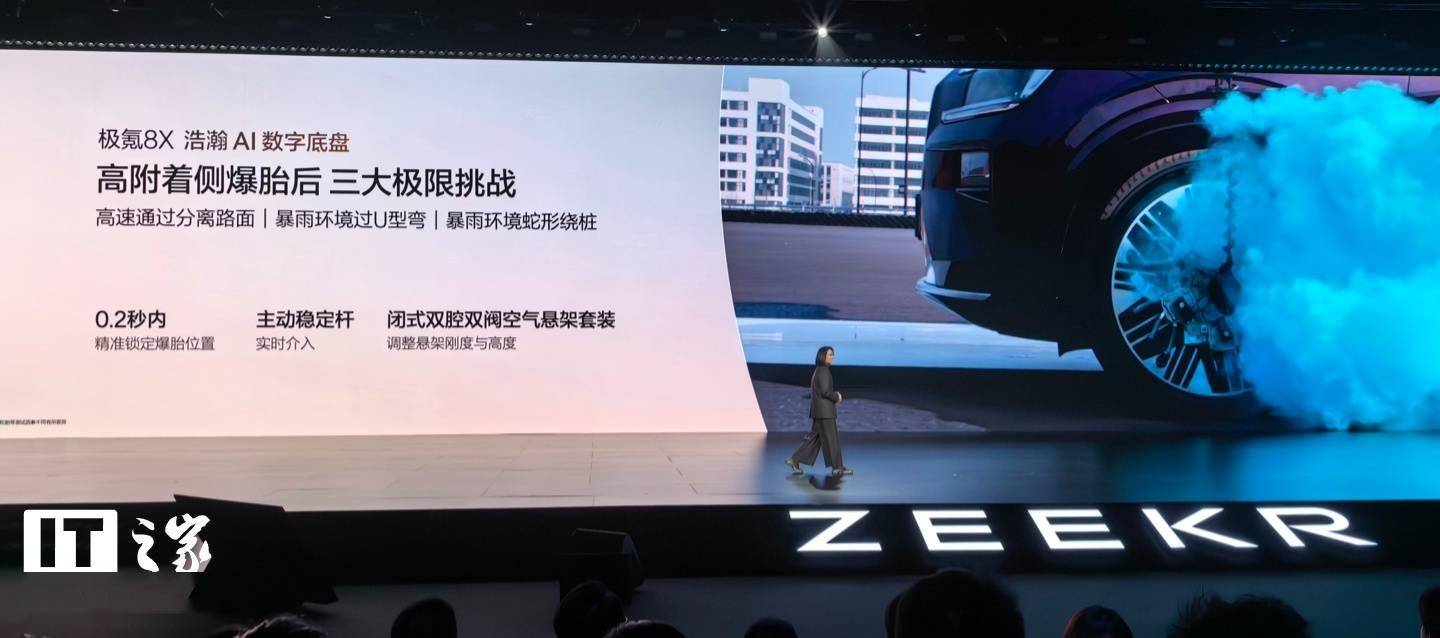 在热管理系统上,极氪8X行业首创十源热泵系统和九通阀技术,实现全车热能的高效循环利用。同时,车辆配备双核随速AGS主动格栅,进一步优化空气动力学表现。底盘方面,浩瀚AI数字底盘带来超级硬件主动稳定杆,具备0.2秒瞬态响应和1400牛·米平衡扭矩,麋鹿测试中干燥路面通过速度达83.6公里/小时,湿滑路面则为76.3公里/小时。闭式双腔空气悬架与双阀CCD电磁减振器的组合,使车辆最大离地间隙达241毫米,调节范围覆盖-30至50毫米。